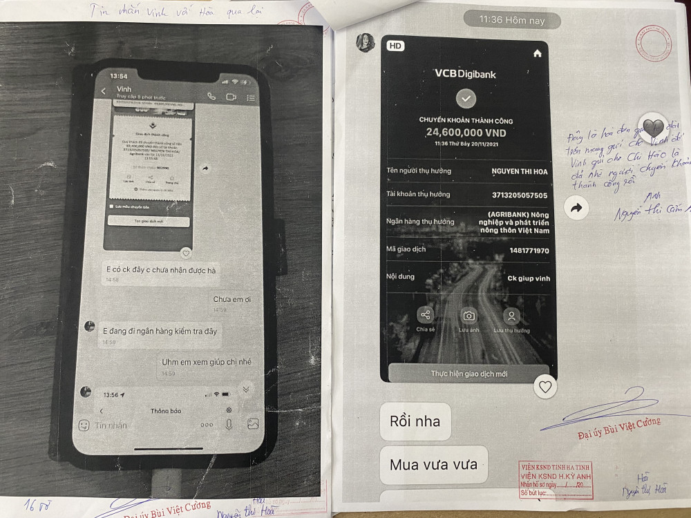 Sau khi chị Hòa cung cấp tài khoản thì Nguyễn Thị Cẩm Anh gửi ảnh chụp màn hình một hóa đơn giả được Cẩm Anh đặt làm từ một người quen biết trên mạng xã hội với giá 50.000đ/1 hóa đơn giả, thể hiện đã chuyển cho chị Hòa. Chị Hòa tin tưởng số vàng trên đã được thanh toán nên đã gửi vàng cho Cẩm Anh qua xe buýt chạy tuyến vào thị xã Kỳ Anh, Hà Tĩnh.