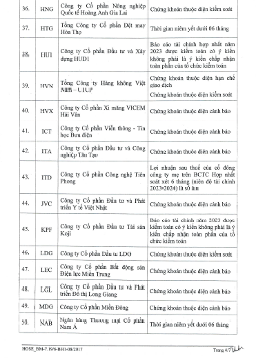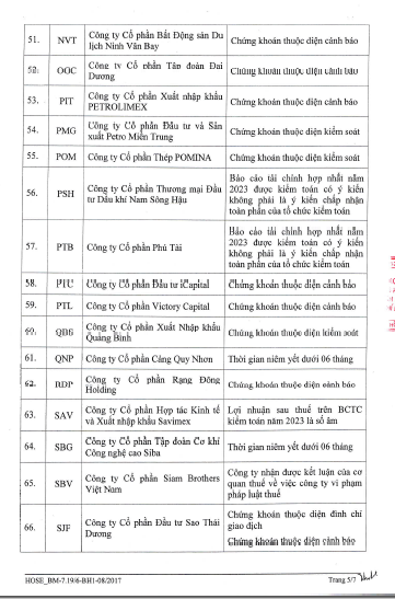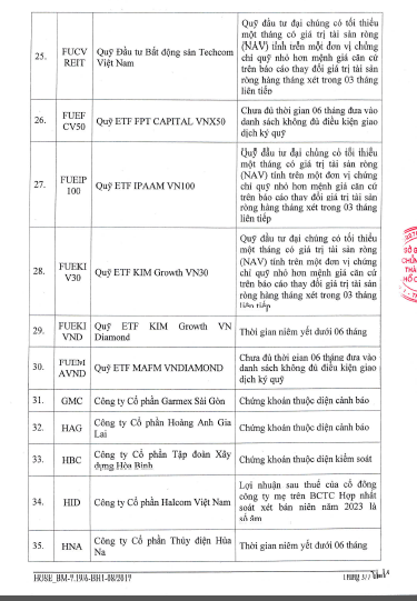 Phần lớn các cổ phiếu trong danh sách thuộc diện kiểm soát, cảnh báo như: AGM, CKG, DAG, EVG, HAG, HBC, HNG, ITA, PIT, POM, TVB, VNE,… Trong đó, SJF còn thuộc diện đình chỉ giao dịch, HVN thuộc diện hạn chế giao dịch.