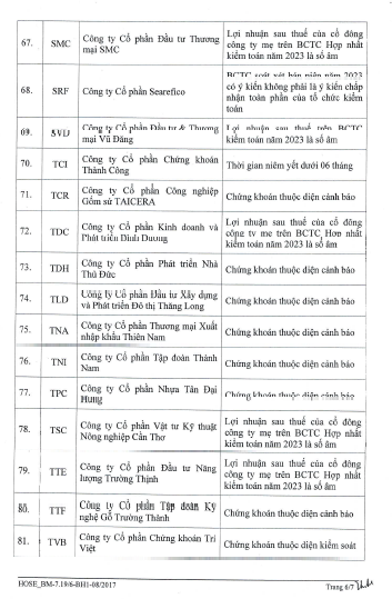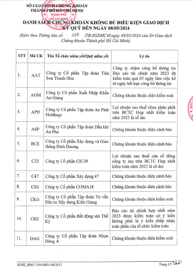 Trong danh sách còn có cổ phiếu AAT do công ty chậm công bố thông tin báo cáo tài chính năm 2023 đã kiểm toán quá 5 ngày làm việc kể từ ngày hết hạn công bố thông tin.