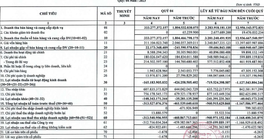 Trong kỳ, doanh thu tài chính giảm 71,7% về còn 8,59 tỷ đồng. Chi phí bán hàng và chi phí quản lý doanh nghiệp được tiết giảm 24% và 49% còn hơn 1,9 tỷ đồng và gần 14 tỷ đồng. Tuy nhiên, chi phí lãi vay tăng 48% lên tới 214 tỷ trong quý 4. Ngoài ra, công ty cũng ghi nhận khoản lỗ khác 148 tỷ (không được thuyết minh).