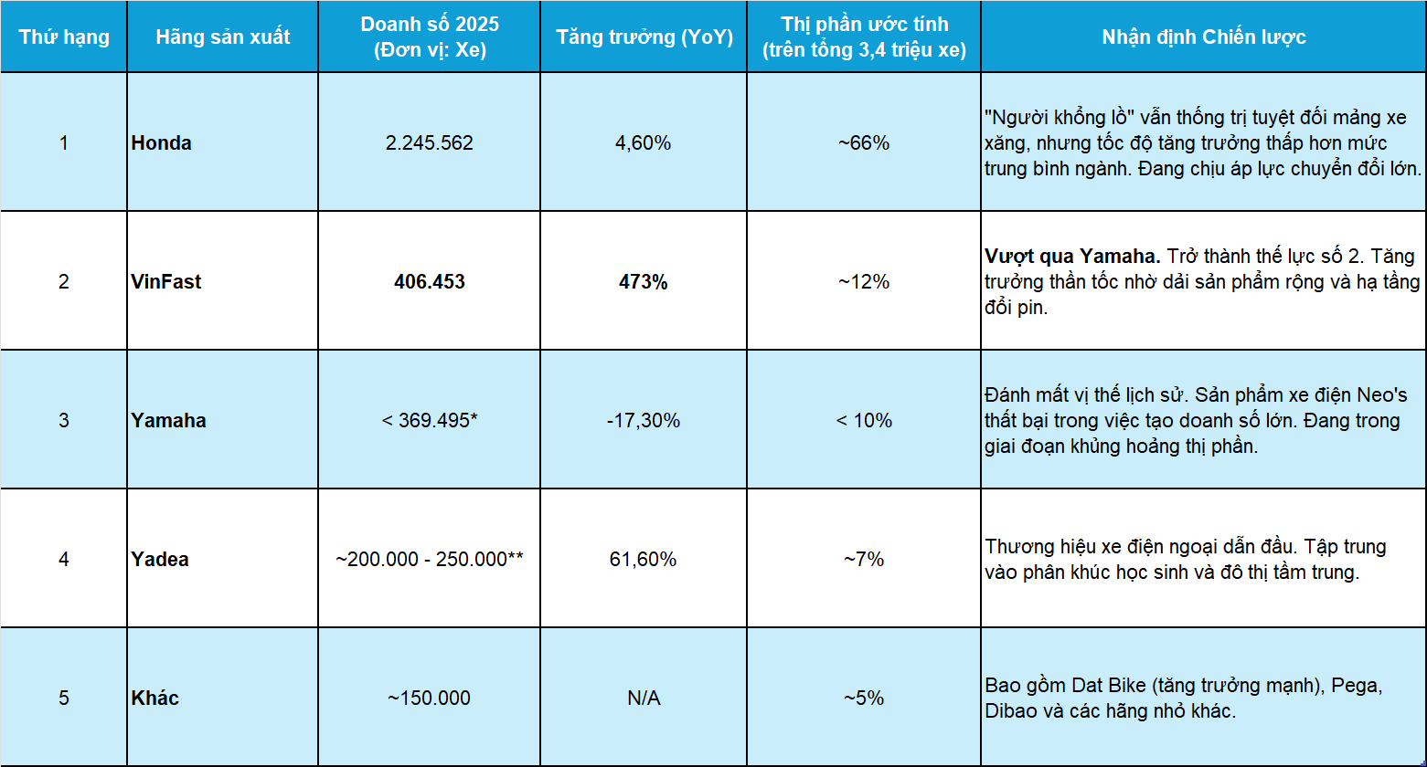 *Ghi chú: Con số 369.495 là tổng của Yamaha, Suzuki, SYM, Piaggio. Yamaha chiếm phần lớn nhưng chắc chắn thấp hơn 406.453 của VinFast.