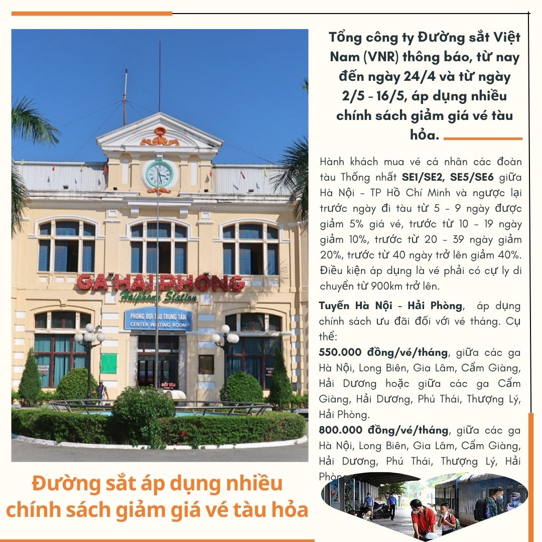 Ngành đường sắt áp dụng nhiều chính sách giảm giá đến tháng 5/2024, giảm giá vé cá nhân tàu Thống nhất khi mua xa ngày đi tàu đến 30%.