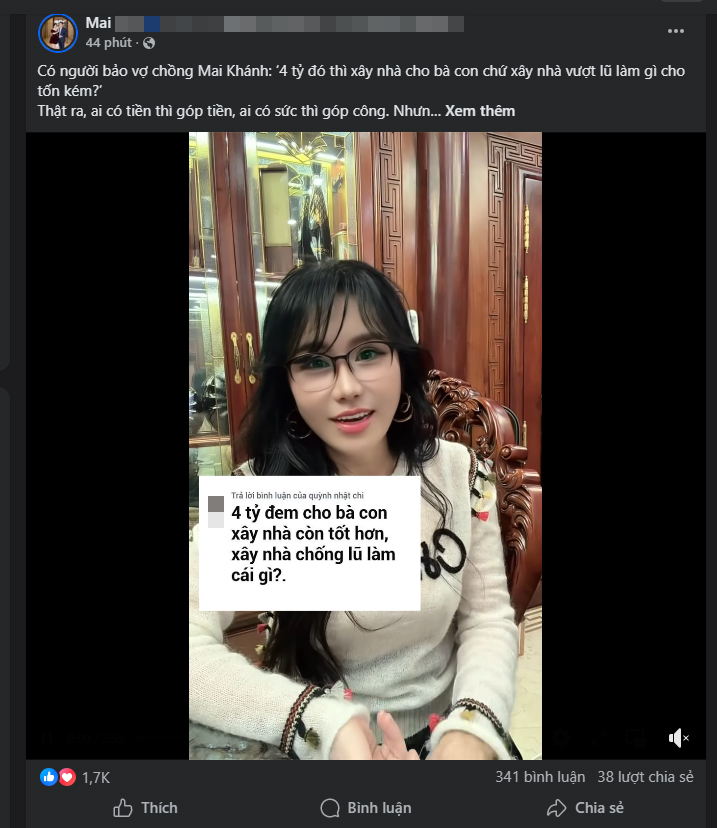 Trước những ý kiến trái chiều, mới đây chị Mai đã có chia sẻ dài trên Facebook. Nữ doanh nhân tâm sự: "Có người bảo vợ chồng Mai Khánh: ‘4 tỷ đó thì xây nhà cho bà con chứ xây nhà vượt lũ làm gì cho tốn kém?’