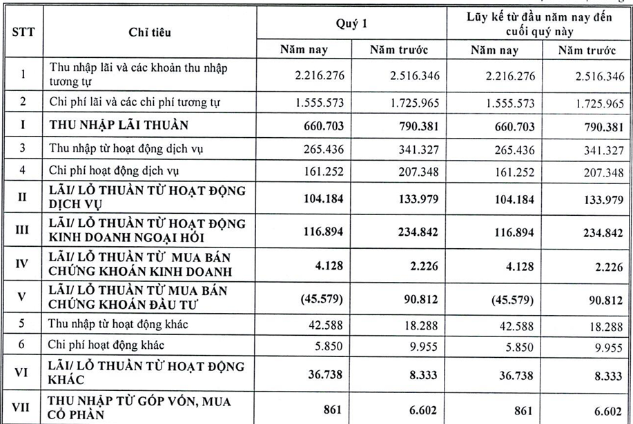 Trong quý đầu năm, thu nhập lãi thuần của ABBank mang về hơn 660 tỷ đồng, tương đương giảm 16,4% so với cùng kỳ năm trước. Lãi thuần từ dịch vụ và kinh doanh ngoại hối lần lượt giảm 22% và 50% mang về 104 tỷ đồng và 116 tỷ đồng.