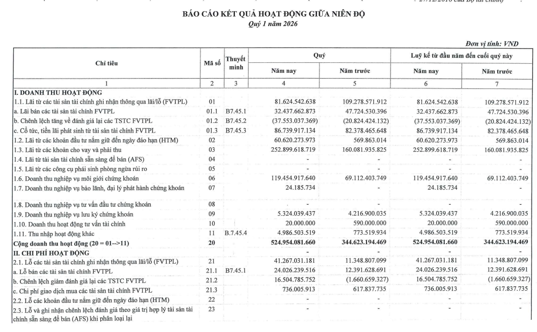 Trong cơ cấu doanh thu, mảng cho vay và phải thu tiếp tục đóng vai trò chủ lực khi mang về gần 253 tỷ đồng, tăng 58% và chiếm khoảng một nửa tổng doanh thu. Hoạt động môi giới cũng ghi nhận tăng trưởng tích cực, đạt hơn 119,4 tỷ đồng, tăng hơn 72%.