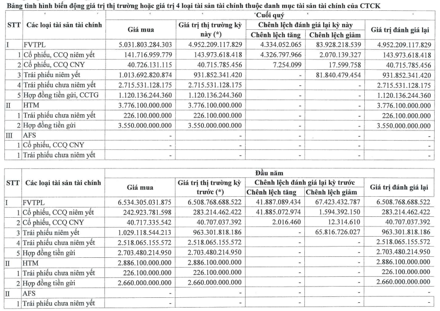 Trong đó, khoản lỗ đánh giá lại gia tăng đáng kể, chủ yếu đến từ trái phiếu niêm yết – nhóm tài sản chịu tác động trực tiếp từ môi trường lãi suất tăng. Riêng phần chênh lệch giảm đánh giá lại lên tới gần 84 tỷ đồng, trong đó trái phiếu niêm yết đóng góp phần lớn.