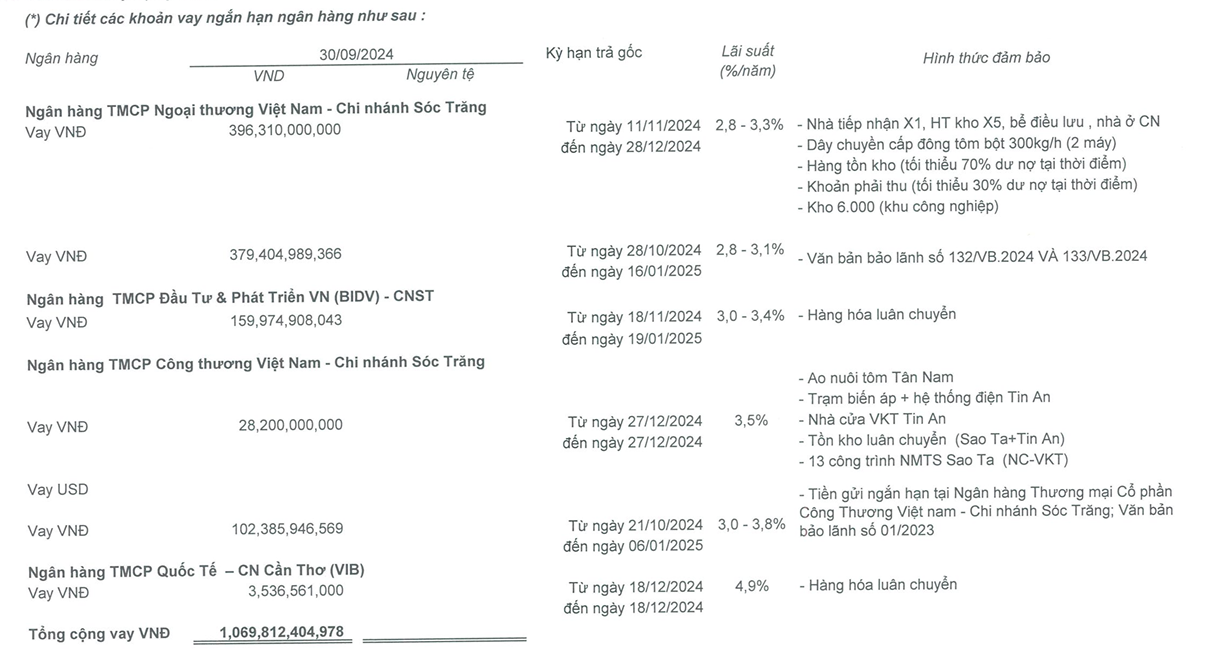 Về phía nguồn vốn, tính tới cuối quý 3, Sao Ta đang còn 1.428,2 tỷ đồng nợ phải trả, trong đó tập trung ở vay ngắn hạn 1.069,8 tỷ đồng, chiếm 75% tổng nợ phải trả. Tổng nợ vay của Thực phẩm Sao Ta tăng 29,8% so với đầu năm, tương ứng tăng thêm 245,7 tỷ đồng, lên 1.069,8 tỷ đồng và bằng 46,9% tổng vốn chủ sở hữu. Trong đó, toàn bộ nợ vay là nợ vay ngắn hạn tại các ngân hàng.