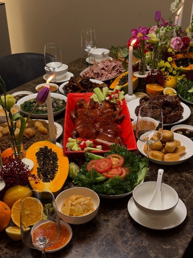 Bữa tiệc gồm nhiều món Trung Hoa như heo sữa quay, miến xào sò điệp, cải xào hào, bê thui, sườn Kinh Đô, chim quay, cơm chiên hải sản được trang trí rất bắt mắt.