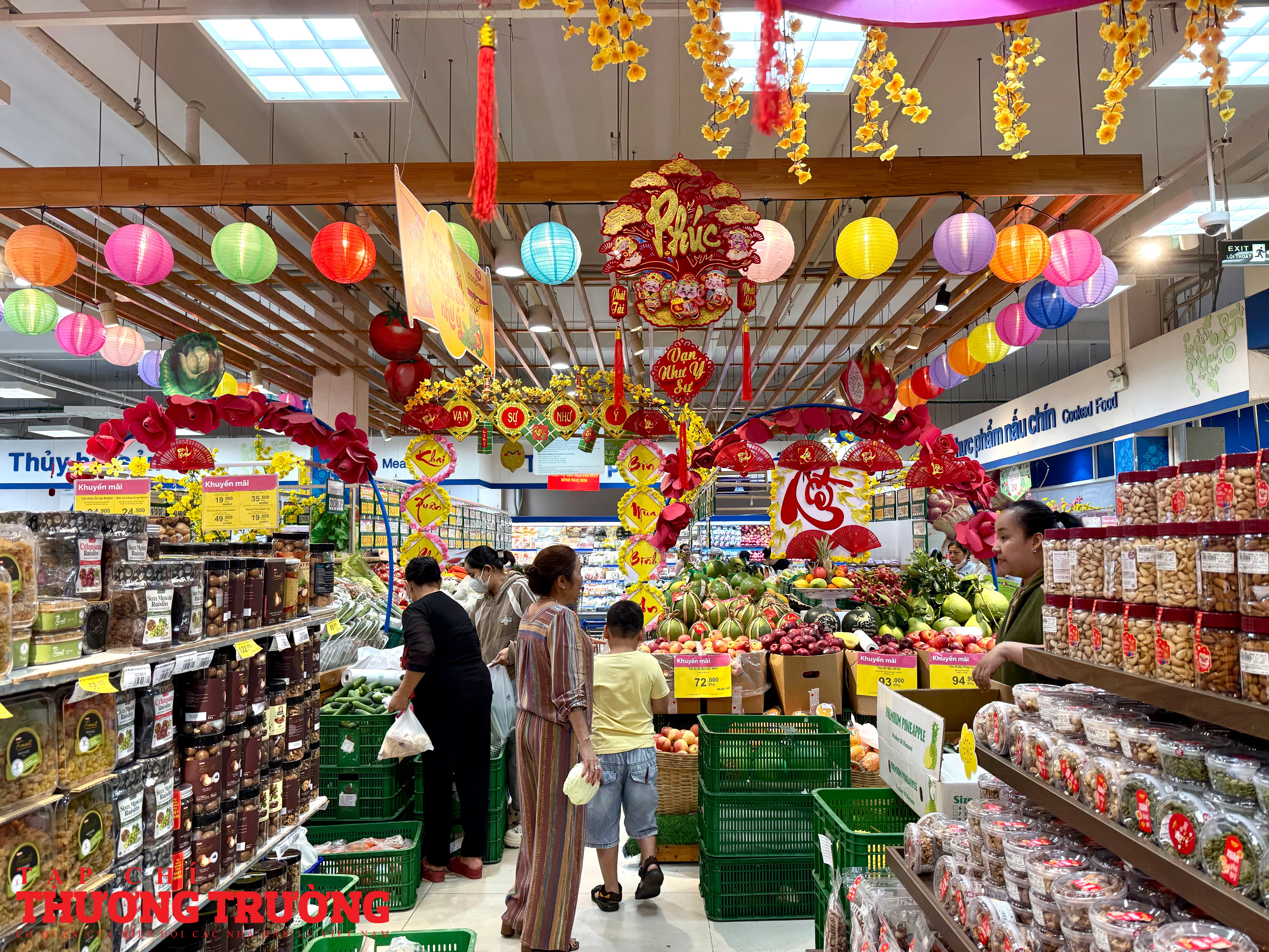 Bên trong siêu thị, khu trái cây được trang hoàng đậm không khí xuân với tiểu cảnh và băng rôn Tết, khách hàng lựa chọn hàng hóa chuẩn bị mâm cỗ.