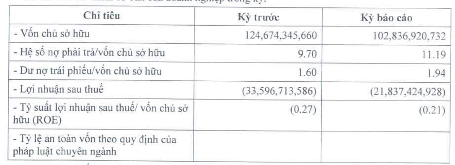 Hệ số nợ phải trả trên vốn chủ sở hữu tăng từ 9,7 lần lên 11,19 lần, tương ứng nợ phải trả hơn 1.150 tỷ đồng. Dư nợ trái phiếu là hơn 199,5 tỷ đồng.