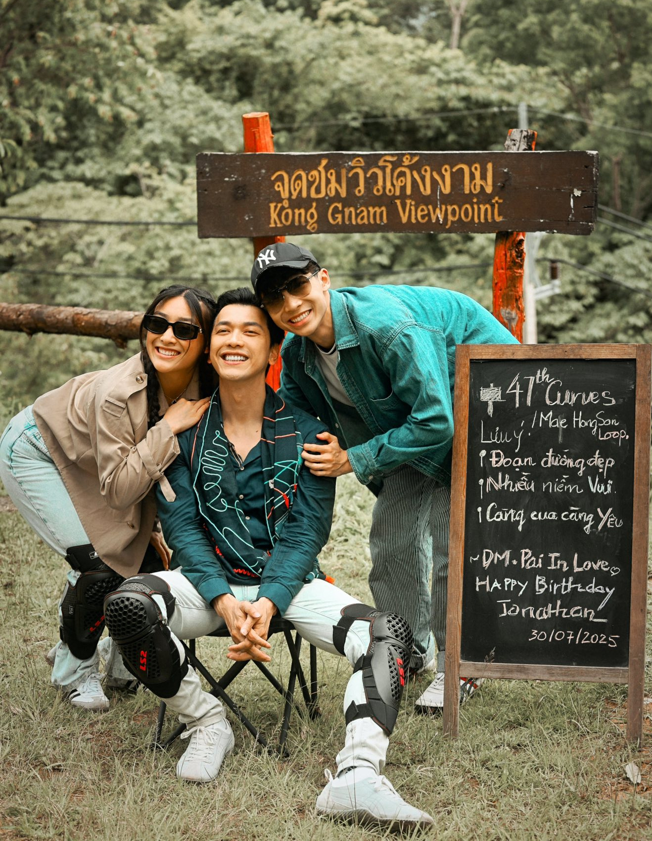 "Lần đầu cầm lái chiếc 500cc khởi hành từ Chiangmai, vượt qua 4088 cua quanh co ôm những dãy núi ngút ngàn... đủ những nắng, mưa, sương mù, gió bạt… Đọng lại là những trải nghiệm cùng mấy đứa em khám phá những cung đường mới mẻ. Cả đám giành trọn 6 ngày để hát đủ.. 7749 lần chúc mừng sinh nhật", anh viết.
