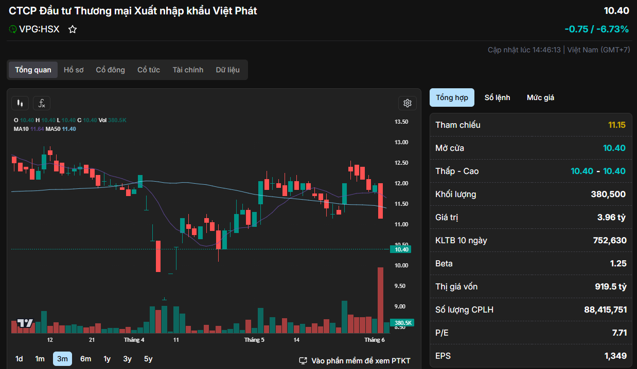 Đến sáng 4/6, cổ phiếu VPG giảm kịch sàn hai phiên liên tiếp, chạm mức 10.400 đồng/cổ phiếu, mức thấp nhất kể từ khi niêm yết. Khối lượng khớp lệnh chỉ đạt khoảng 380.000 cổ phiếu, trong khi dư bán giá sàn lên tới gần 6 triệu đơn vị, cho thấy tâm lý hoảng loạn của nhà đầu tư. So với đầu năm 2025, giá cổ phiếu VPG đã mất hơn 30% giá trị, phản ánh sự mất niềm tin nghiêm trọng vào doanh nghiệp sau vụ việc.