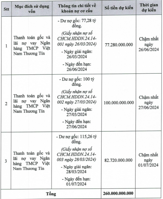 Về kế hoạch sử dụng vốn, BMS cho biết toàn bộ số tiền 260 tỷ đồng thu về sẽ được dùng thanh toán các khoản gốc và lãi vay ngắn hạn tại Ngân hàng TMCP Việt Nam Thương Tín (Vietbank) đến hạn vào các ngày 26-27/06 và 01/07. Đây đều là các khoản vay được giải ngân từ cuối tháng 3 vừa qua, tổng dư nợ gốc gần 293 tỷ đồng.