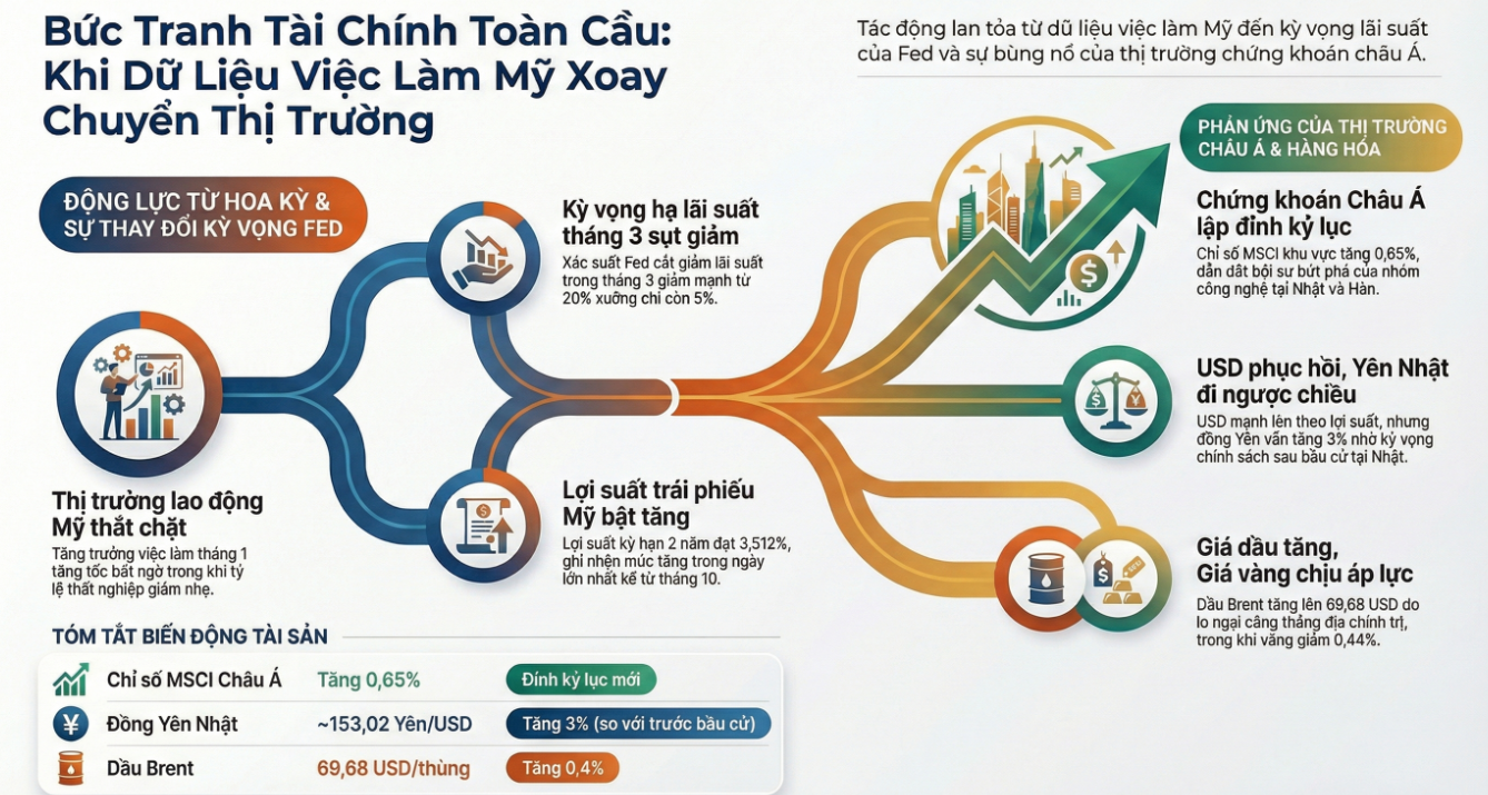 Chứng khoán châu Á tăng mạnh lên mức cao kỷ lục trong phiên sáng 12/2, khi dữ liệu việc làm Mỹ vượt kỳ vọng khiến lợi suất trái phiếu bật tăng và thị trường giảm dần kỳ vọng Fed sớm hạ lãi suất.