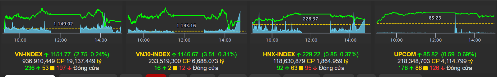 Kết phiên, VN-Index dừng ở mức 1.151 điểm tăng 2,75 điểm (0,24%); VN30 tăng 3,51 điểm (0,31%) lên mức 1.146,67 điểm. HNX-Index tăng 0,85 điểm (0,85%) lên mức 229,22; UPCoM tăng 0,59 điểm (0,69%) lên mức 85,82 điểm.