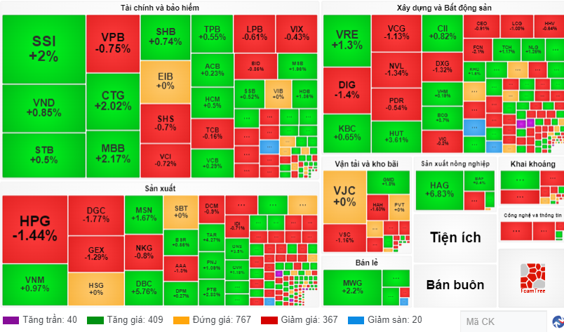 Ngoài bất động sản thì cũng không có nhóm cổ phiếu nào giảm điểm quá đáng kể. Sắc đỏ chủ yếu đến từ các cổ phiếu riêng lẻ như AAA (-1.30%), GEX (-1.29%) hay VCG (-1.13%).