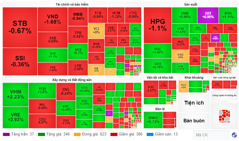 Nhóm ngân hàng nhuộm đỏ bảng điện, giảm mạnh nhất là LPB -3,1%, NVB -2,7%. Các mã khác như CTG, VIB, VPB hạ 1-1,3% thị giá, số còn lại giảm quanh 0,7-0,9%. VCB giữ với mức tăng 1,1%, tuy nhiên không đủ để kéo chỉ số.Bên cạnh nhóm ngân hàng thì chứng khoán cũng là nhóm có mức giảm đáng kể. Hàng loạt cổ phiếu lớn trong nhóm đều giảm điểm tương đối mạnh. Một số cái tên đáng chú ý có thể kể đến như VND (-1.68%), HCM (-1.32%) hay VIX (-1.30%).