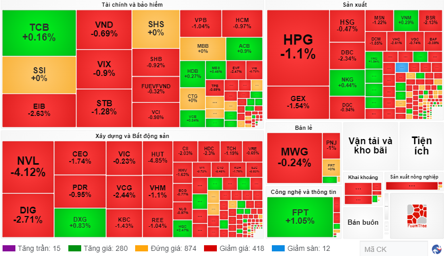 Nhìn chung, thị trường phiên chiều diễn biến khá tiêu cực. Giá trị khớp lệnh sàn HOSE cũng chỉ hơn 12 ngàn tỷ đồng, giảm 25% so với phiên trước.