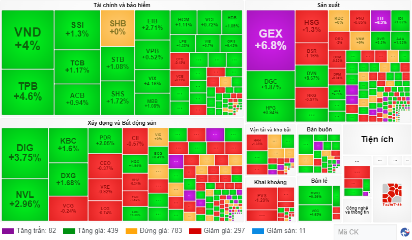 Nhiều mã đột biến như GEX đột ngột tăng chạm trần với thanh khoản cả ngày lên 599,6 tỷ đồng, mức cao nhất kể từ tháng 4/2022. TTF cũng vọt lên kịch trần, xác lập mức thanh khoản 91,7 tỷ đồng, lớn nhất kể từ thời điểm giá đạt đỉnh cuối tháng 3/2022.