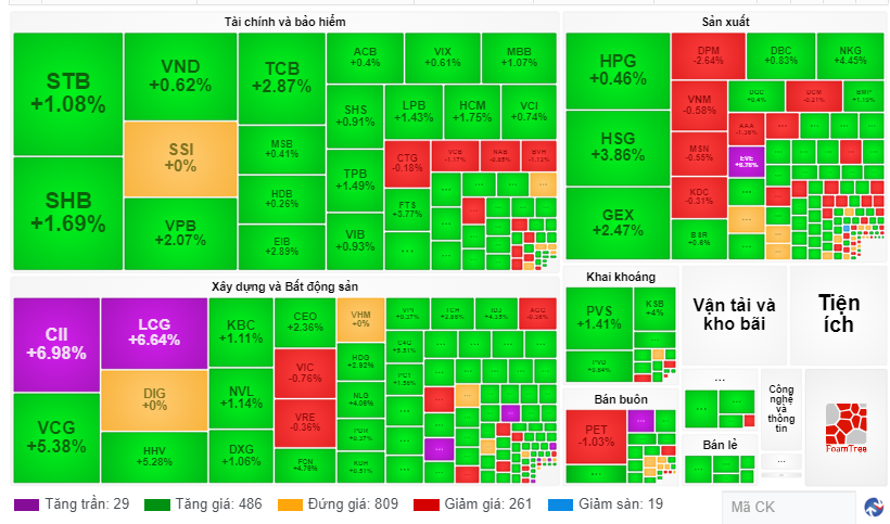 Nhóm cổ phiếu xây dựng có phiên đầu tuần đầy tích cực, nổi bật với HBC, CII và LCG tăng kịch trần cùng thanh khoản dồi dào. Nhiều cổ phiếu khác trong nhóm xây dựng cũng đều giữ mức tăng tốt từ 2% đến 5%, như HHV, VCG, HUT, TCD, GCN, HDG, IDJ, L18…