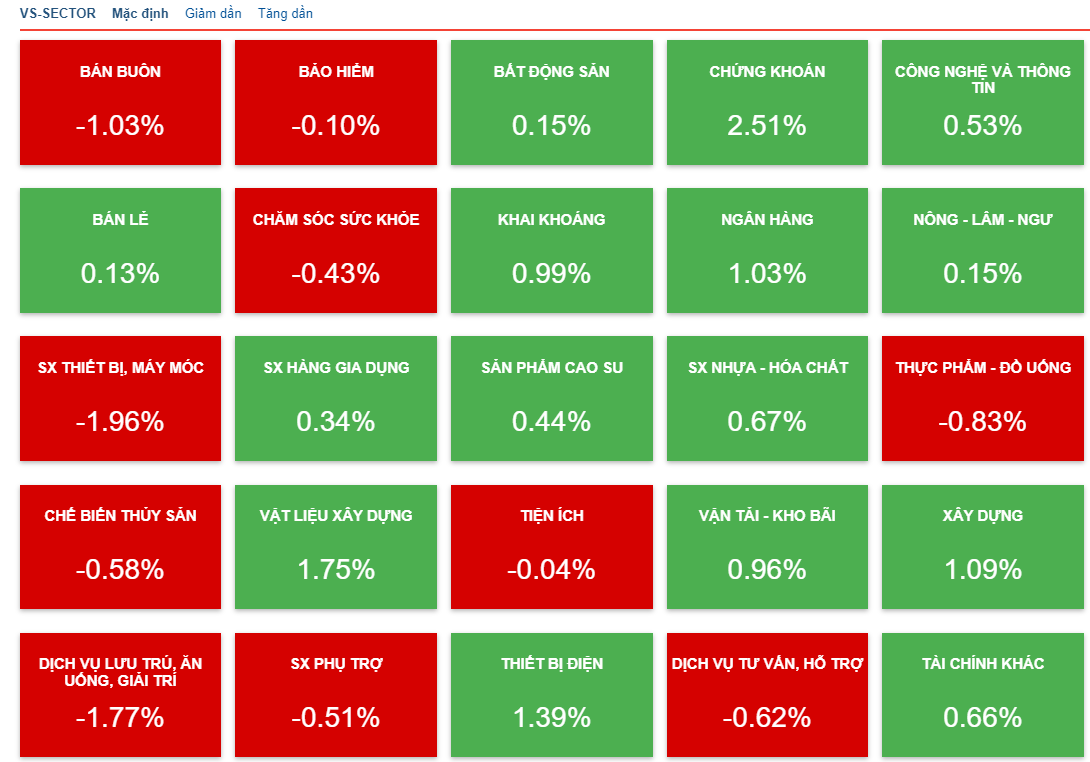 Tính đến đầu phiên chiều, lực cầu chủ yếu tìm đến nhóm cổ phiếu chứng khoán và thép với mức tăng lần lượt là 2,7% và 1,6%.