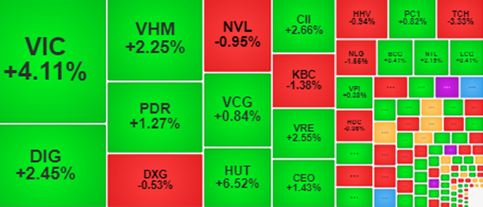 Nhóm cổ phiếu có mức tăng tốt nhất trong ngày hôm nay đó chính là bất động sản. Bên cạnh họ cổ phiếu nhà Vingroup thì rất nhiều cổ phiếu khác trong nhóm cũng đồng loạt có được mức tăng ấn tượng. Điển hình có thể kể đến như CII (+2.66%), DIG (+2.45%) hay PDR (+1.27%).