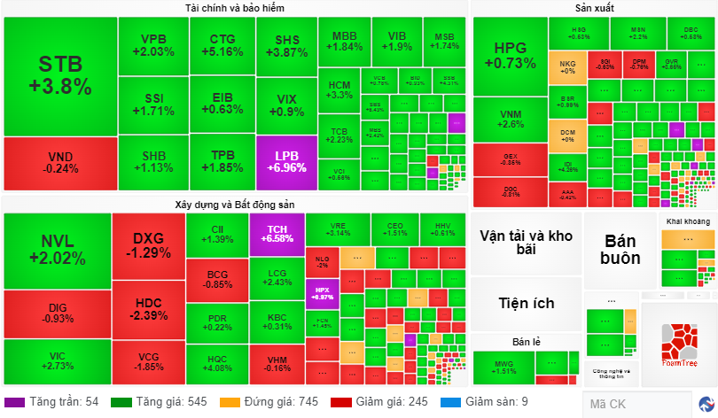 Thanh khoản thị trường duy trì mức cao với sự gia nhập mạnh mẽ của dòng tiền mới. Khối lượng giao dịch trên sàn HoSE được đẩy lên mức 1,3 tỷ cổ phiếu, giá trị giao dịch đạt 26.533 tỷ đồng; HNX có 120 triệu cổ phiếu giao dịch tương ứng 1.952 tỷ đồng và sàn UPCoM là 84 triệu cổ phiếu tương ứng 1.144 tỷ đồng.