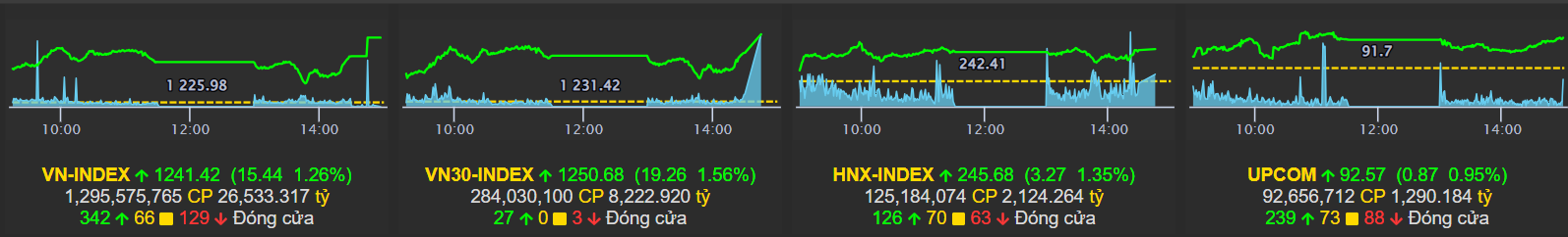 Kết phiên, VN-Index tăng 15,44 điểm (+1,26%) lên mức 1.241,42 điểm ; HNX-Index tăng 3,27 điểm lên 245,68 điểm. UPCoM-Index tăng 0,87 điểm tương ứng 0,95%.
