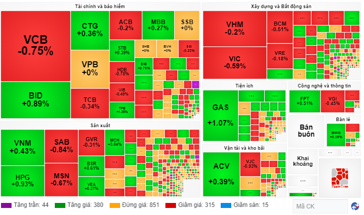 Các bluechip biến động không đáng kể và phân hóa mạnh, với nhóm VN30 có 13 mã tăng, 15 mã giảm, cùng VPB và BVH đứng tham chiếu. Dòng tiền đầu cơ tìm kiếm cơ hội T+ ngắn hạn đã gia tăng khá mạnh vào một số cổ phiếu nhỏ, với nhiều cái tên đã đóng cửa ở mức giá trần, như ABS, BTP, CIG, EVG, HHP, TSC, VIX, YEG, FIT, ST8, TGG, MCG và QBS.