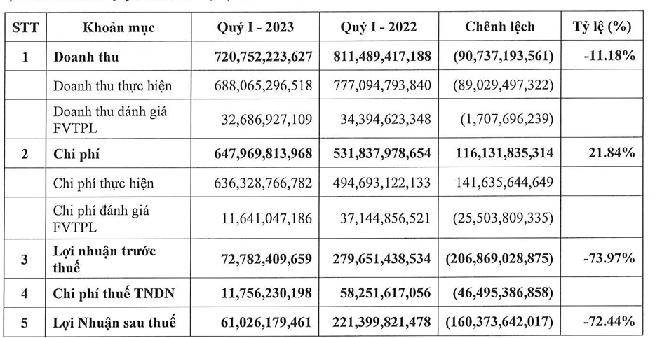 Doanh thu môi giới chứng khoán giảm gần 3 lần xuống còn 8,5 tỷ đồng. Doanh thu nghiệp vụ tư vấn đầu tư chứng khoán giảm từ 14,3 tỷ đồng xuống còn 1 tỷ đồng. Ngược lại doanh thu từ nghiệp vụ lưu ký chứng khoán tăng mạnh lên 324 tỷ đồng.