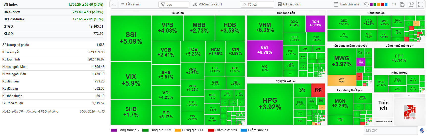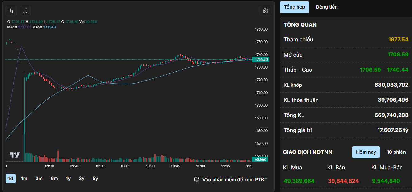 Tính đến kết phiên sáng 11h30, VN-Index duy trì đà tăng 58,66 điểm (+3,5%) lên 1.736,2 điểm, HNX-Index tăng 5,1 điểm (+2,07%) lên 251,8 điểm, trong khi UPCoM-Index tăng 2,01 điểm (+1,6%) lên 127,65 điểm. Giá trị giao dịch trên cả ba sàn đạt khoảng 17.600 tỷ đồng.