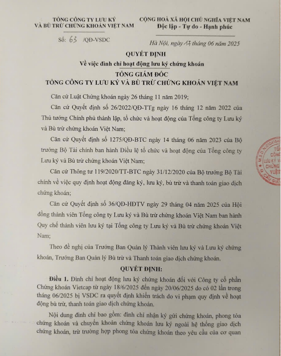 Tổng Công ty Lưu ký và Bù trừ Chứng khoán Việt Nam (VSDC) đã ra quyết định về việc đình chỉ hoạt động lưu ký chứng khoán đối với CTCP Chứng khoán Vietcap (mã: VCI).