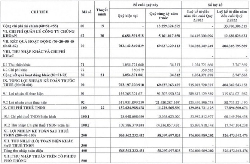 Không những doanh thu gần gấp đôi, chi phí hoạt động quý 2 còn được hoàn nhập 20 tỷ đồng, trong khi cùng kỳ ghi nhận gần 236 tỷ đồng. Lý do chủ yếu là VIX ghi âm 39 tỷ đồng khoản lỗ các tài sản tài chính, trong khi cùng kỳ quý 2/2022 lỗ 204 tỷ đồng.