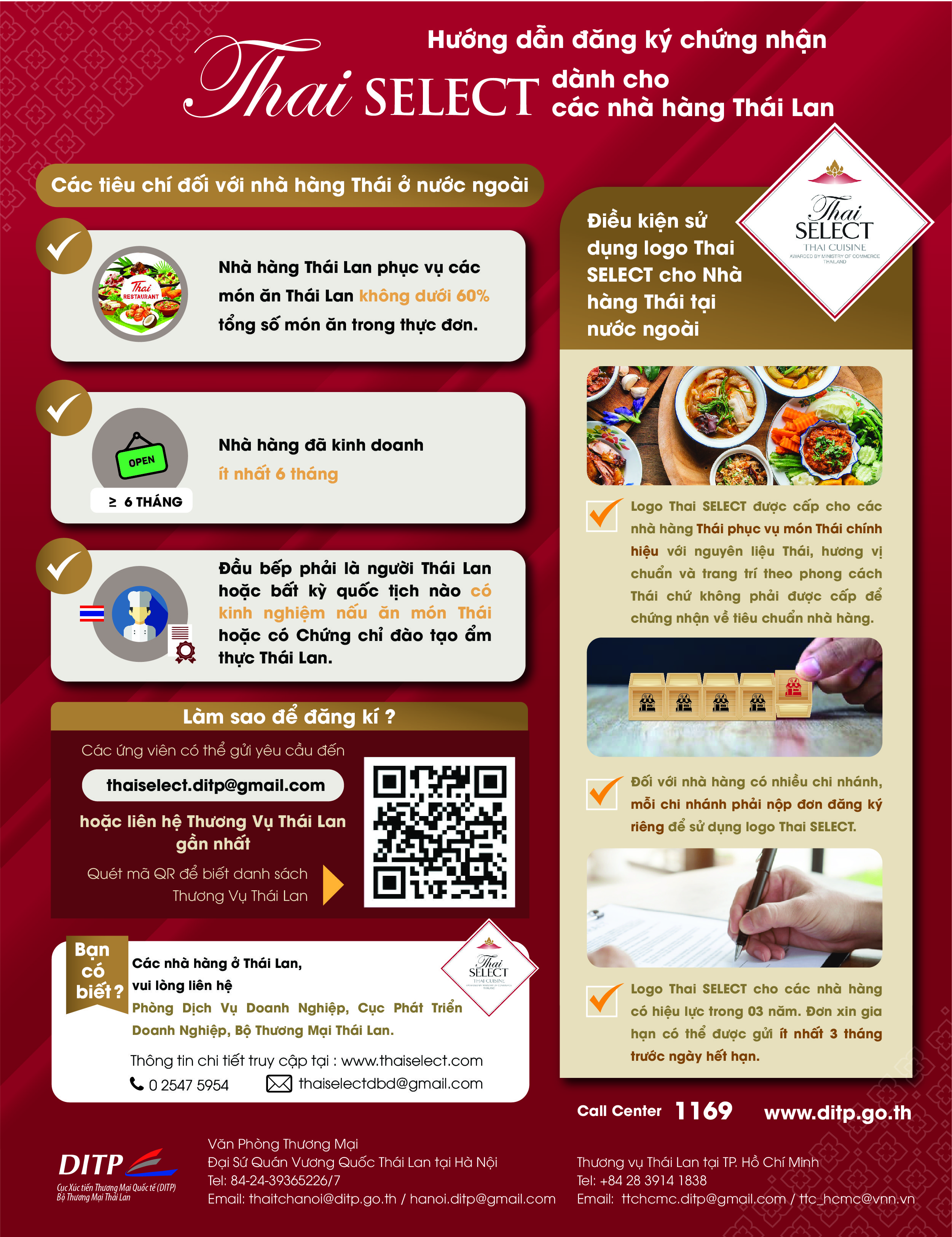 Để tìm hiểu thêm thông tin về dự án “Thai SELECT” cũng như đăng ký chứng nhận “Thai SELECT” cho nhà hàng Thái Lan và thực phẩm Thái Lan chế biến sẵn, xin hãy liên hệ với Thương Vụ Thái Lan gần nhất.