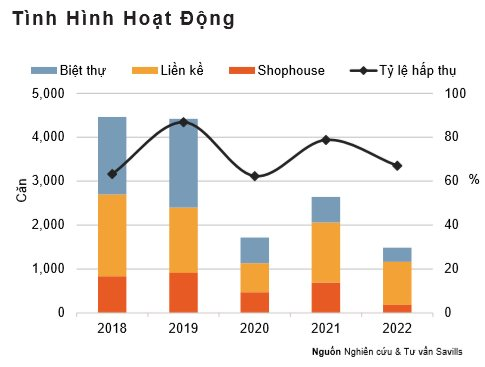 Quý cuối cùng của năm 2022, có 196 căn được bán, giảm 34% theo quý và 52% theo năm. Tỷ lệ hấp thụ hàng quý là 21%, giảm 4 điểm phần trăm theo quý và 15 điểm phần trăm theo năm. Lượng mở bán mới được hấp thụ 51%. Trong Q4/2022, biệt thự, nhà liền kề có đợt giảm giá thứ cấp đầu tiên kể từ năm 2019 và giá shophouse giảm kể từ Q3/2022.