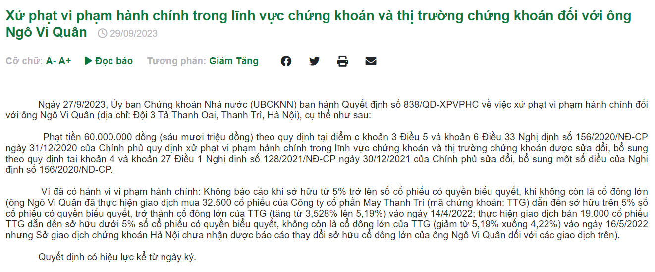 Theo đó, ông Ngô Vi Quân đã có hành vi vi phạm gồm: không báo cáo khi sở hữu từ 5% trở lên số cổ phiếu có quyền biểu quyết, khi không còn là cổ đông lớn. Tổng số tiền phạt là 60 triệu đồng.