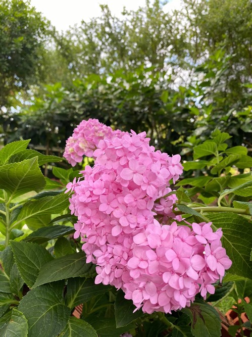 Trong vườn còn có cả hoa cẩm tú cầu. Loại hoa này có màu sắc đẹp và nhờ thành từng chùm lớn.