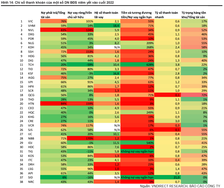 Ngoài ra, VNDirect ước tính tỷ số thanh toán hiện thời và hệ số thanh toán lãi vay của các doanh nghiệp bất động sản niêm yết hiện tại đã giảm mạnh xuống mức thấp nhất của giai đoạn 2011-2013, điều này cho thấy khả năng xảy ra rủi ro mất khả năng thanh toán cao như năm 2011.