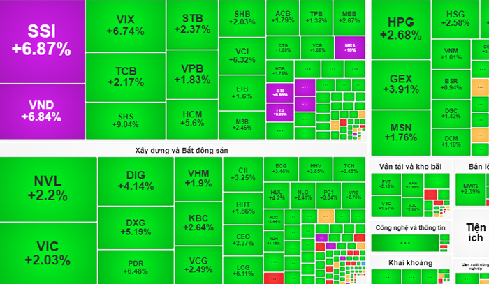 Đáng chú ý trong phiên giao dịch hôm nay, dòng tiền mua lan toả trên diện rộng nên tất cả các nhóm ngành đều kết phiên trong sắc xanh. Nhưng, nhóm chứng khoán vẫn cho thấy sự bứt tốc mạnh mẽ nhất trong phiên, giúp vốn hoá nhóm này tăng gần 7%. Ngoài mà SSI, hàng loạt mã khác cũng tăng trần, gồm VND, FTS, MBS, BSI, CTS, AGR... SHS tăng 9%; nhiều mã tăng 5-7% như VIX, VIG, VDS, VCI, PSI, SBS, ORS... Không có mã nào ở chiều giảm.