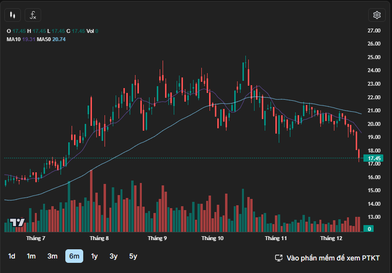 Trên thị trường, cổ phiếu DIG đang chịu áp lực giảm giá mạnh. Kết phiên giao dịch ngày 15/12, thị giá DIG dừng ở mức 17.450 đồng/cổ phiếu, giảm khoảng 22% so với một quý trước và chính thức đánh mất mốc 19.000 đồng/cổ phiếu – vùng giá được duy trì trong gần 5 tháng. So với vùng giá thiết lập vào giữa tháng 10, DIG đã giảm gần 30% và hiện giao dịch dưới đường trung bình động dài hạn, phản ánh xu hướng kém tích cực trong trung và dài hạn.