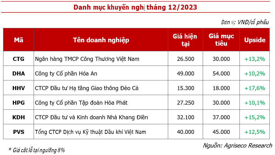 Dưới đây là danh mục được Agriseco Research đánh giá tiềm năng trong tháng 12 năm 2023 nhờ định giá ở mức hợp lý và có câu chuyện tăng trưởng trong cuối năm 2023 và năm 2024.