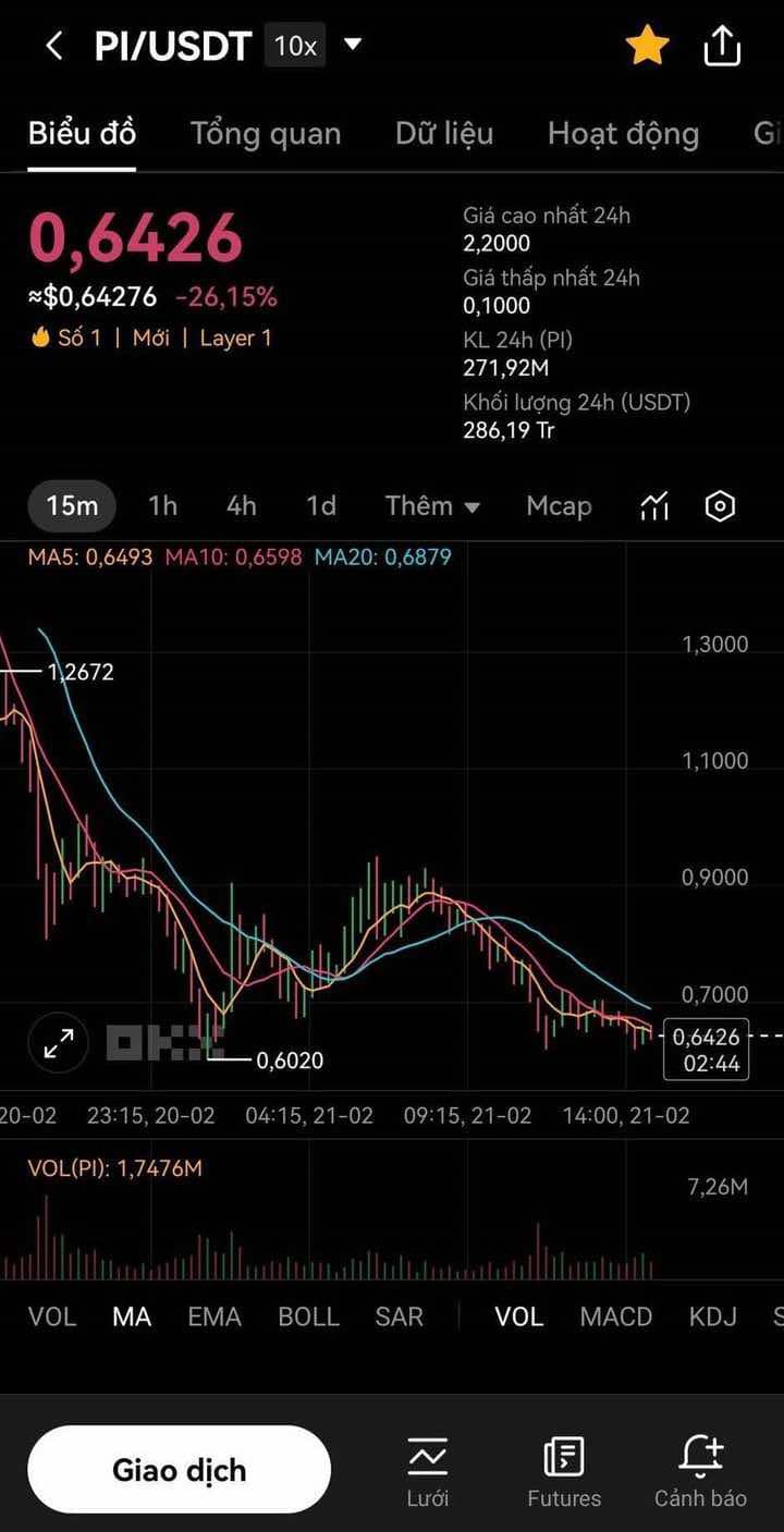 Trong phiên giao dịch đầu tiên, giá Pi biến động mạnh. Ngay sau khi được niêm yết trên OKX, giá Pi chạm mức 2 USD/Pi, có thời điểm gần 3 USD, nhưng sau đó giảm xuống còn 0,9 USD/Pi rồi hồi phục lên 1,6 USD trước khi ổn định quanh 1,1 USD.