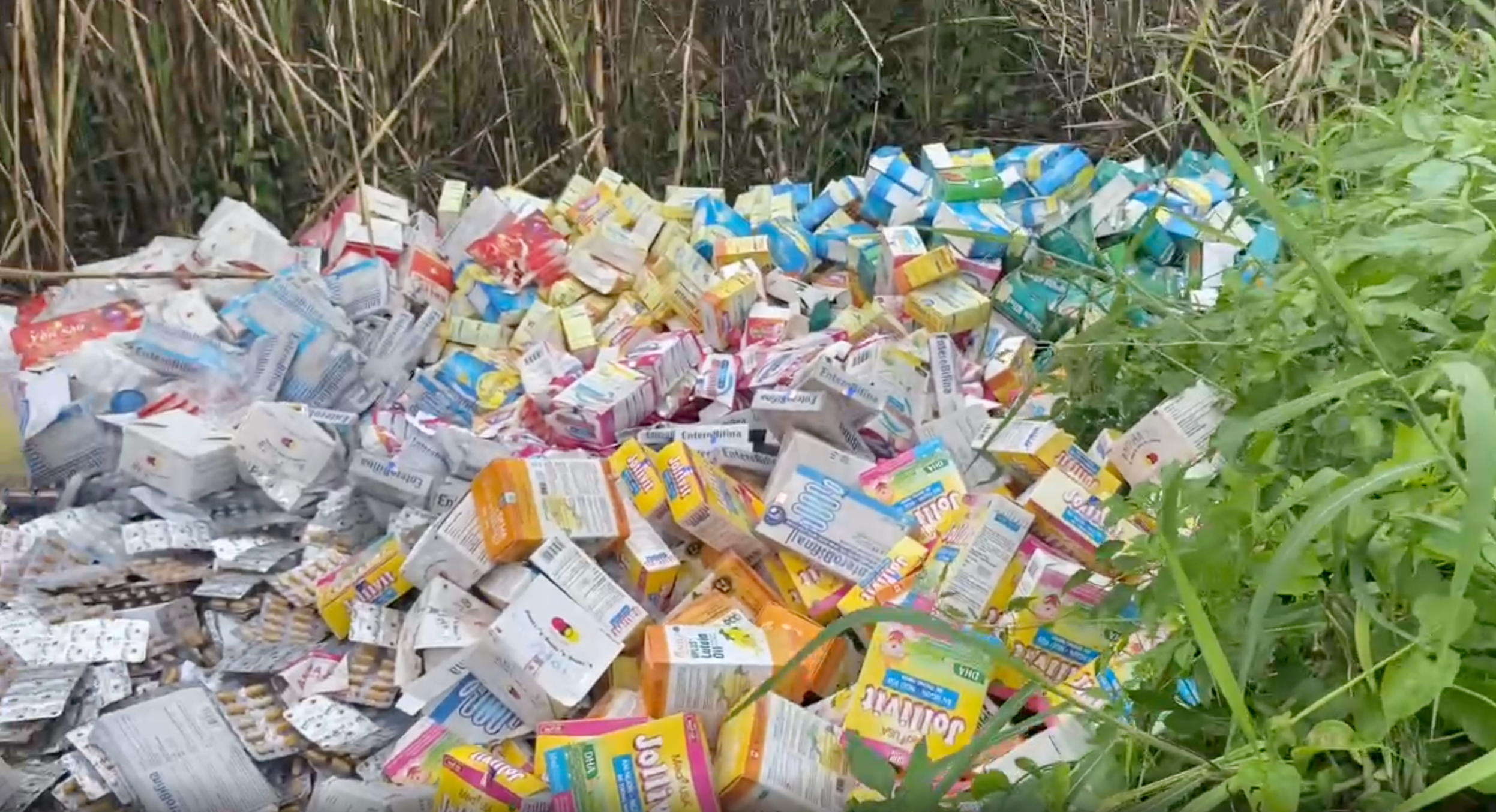 Bước đầu ghi nhận có khoảng 50 kg thuốc và thực phẩm chức năng (dành cho người lớn và trẻ em) đổ tại bãi đất trống thuộc huyện Bình Chánh.