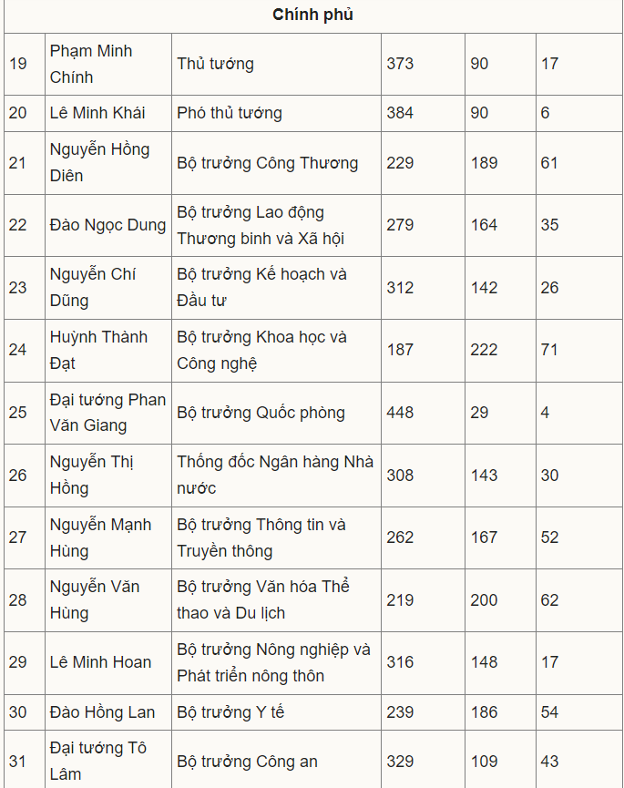 Theo kết quả lấy phiếu tín nhiệm Quốc hội tại Kỳ họp thứ 6 Quốc hội khóa XV vừa công bố chiều nay (25/10), Đại tướng Phan Văn Giang - Bộ trưởng Quốc phòng có số "tín nhiệm cao" với tỉ lệ cao nhất với 448 phiếu (chiếm 93,14% tổng số phiếu thu về); 29 phiếu tín nhiệm (chiếm 6,03% tổng số phiếu thu về) và chỉ có 4 phiếu tín nhiệm thấp (chiếm 0,83% tổng số phiếu thu về).