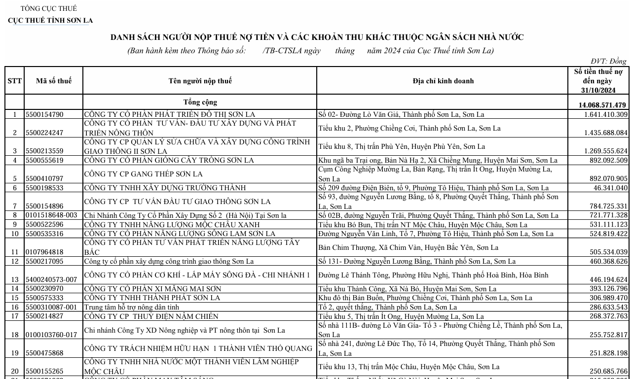 Đứng đầu danh sách là Công ty CP phát triển đô thị Sơn La (địa chỉ: Số 02 đường Lò Văn Giá, thành phố Sơn La, tỉnh Sơn La, mã số thuế 5500154790) nợ số tiền hơn 1,6 tỷ đồng.