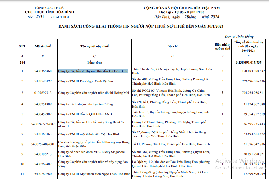 Cục Thuế tỉnh Hòa Bình vừa ban hành Thông báo số 2531/TB-CTHBI, ngày 28/5/2024 về việc công khai danh sách 244 người nộp thuế nợ tiền thuế và các khoản thu khác thuộc ngân sách nhà nước đến thời điểm ngày 30/4/2024, với tổng số tiền 3.138.091.015.735 đồng.