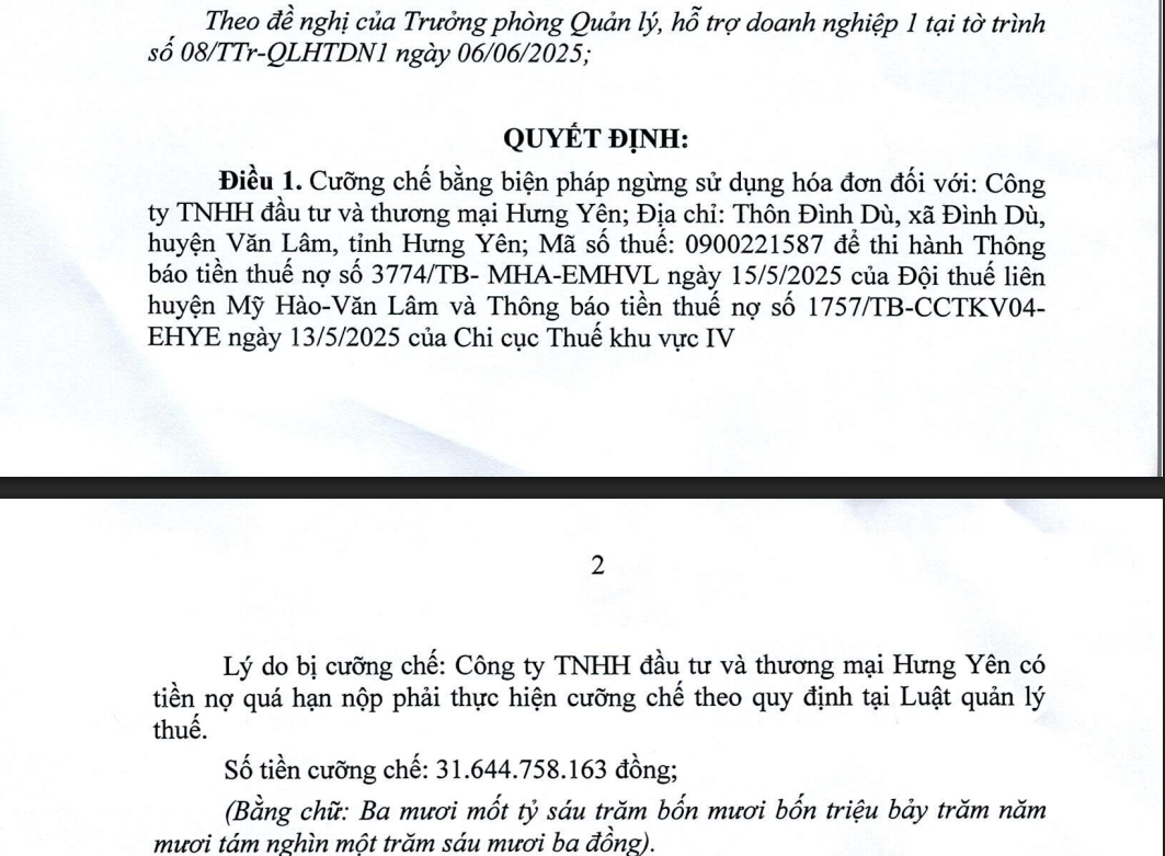 Theo Chi cục Thuế khu vực IV, Công ty TNHH đầu tư và thương mại Hưng Yên (mã số thuế: 0900221587, có địa chỉ: Thôn Đình Dù, xã Đình Dù, huyện Văn Lâm, tỉnh Hưng Yên) bị cưỡng chế thuế ngừng sử dụng hóa đơn do có tiền nợ quá hạn nộp phải thực hiện cưỡng chế theo quy định tại Luật quản lý thuế. Số tiền cưỡng chế hơn 31,6 tỷ đồng.