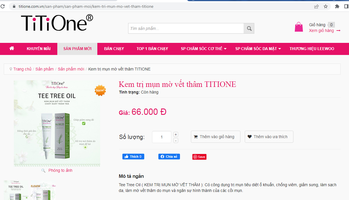 Thực chứng phản ánh của người tiêu dùng, PV nhận thấy tại trang web https://titione.com.vn/ của Công ty TNHH mỹ phẩm TiTione có rất nhiều sản phẩm mỹ phẩm dạng kem, gel đang được giới thiệu có công dụng như thuốc chữa bệnh. Cụ thể, với sản phẩm Tee Tree Oil loại 10g đựng trong lo tròn, loại kem này được Công ty TiTione gọi là “Kem trị mụn mờ vết thêm”. Theo lời giới thiệu, sản phẩm này chiết xuất từ tràm tra, có công dụng “trị mụn tiêu diệt ổ khuẩn, chống viêm, giảm sưng, làm sạch da, làm mờ vết thâm do mụn và ngăn sự hình thành của các cồi mụn”.