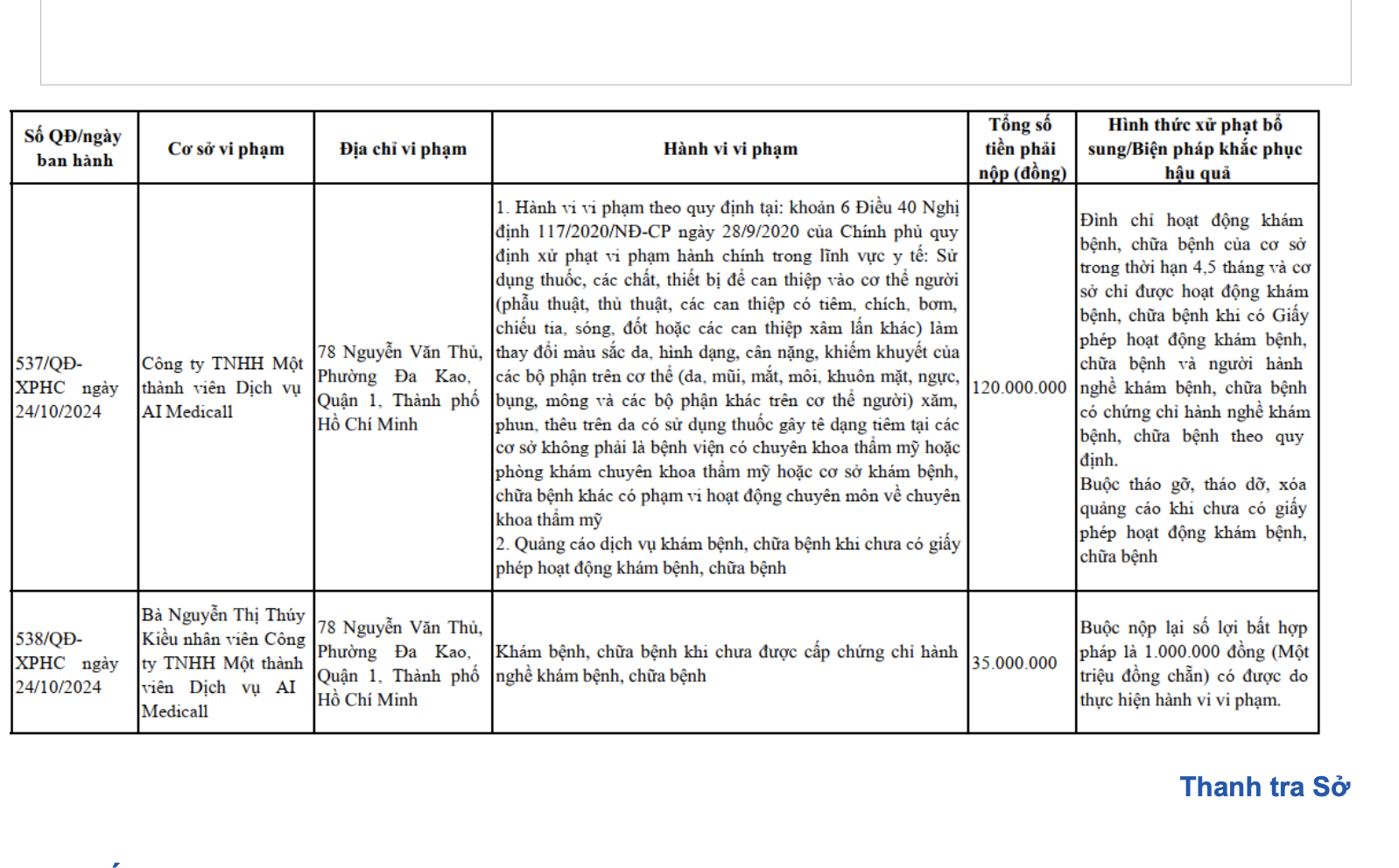 Bên cạnh đó, tại địa chỉ Công ty TNHH MTV dịch vụ AI Medicall, Thanh tra Sở Y tế Phát hiện bà Nguyễn Thị Thuý Kiều (Nhân viên tại đây) có hành vi khám chữa bệnh khi chưa có giấy phép hành nghề. Bà Nguyễn Thị Thuý Kiều bị xử phạt 35 triệu đồng vì thực hiện hành vi trên.