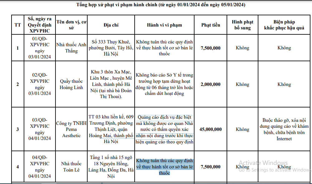 Trong danh sách xử phạt lần này, Sở Y Tế Hà Nội cũng đã xử phạt đối với Nhà thuốc Anh Thắng Số 333 Thụy Khuê, phường Bưởi, Tây Hồ, Hà Nội và Nhà thuốc Toàn Lê Tầng 1 số nhà 15 ngõ 18 Nguyên Hồng, Láng Hạ, Đống Đa, Hà Nội mỗi cở sở 7,5 triệu đồng do Không tuân thủ các quy định về thực hành tốt cơ sở bán lẻ thuốc.